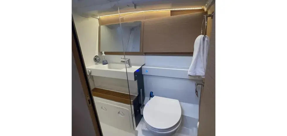 As with every Sun Odyssey, the cockpit ergonomics are second to none. Every sheet is cleverly led to the helm station, where the boat can be easily single or double handed. The massive cockpit lounge is framed by the iconic walk around decks, which make movement around the boat easier than ever before. However, the game changer comes when the convertible coamings, the unfolding seat backs, are set up as beds. The entire aft eight feet of the boat transform into a cushioned sun bathing deck.