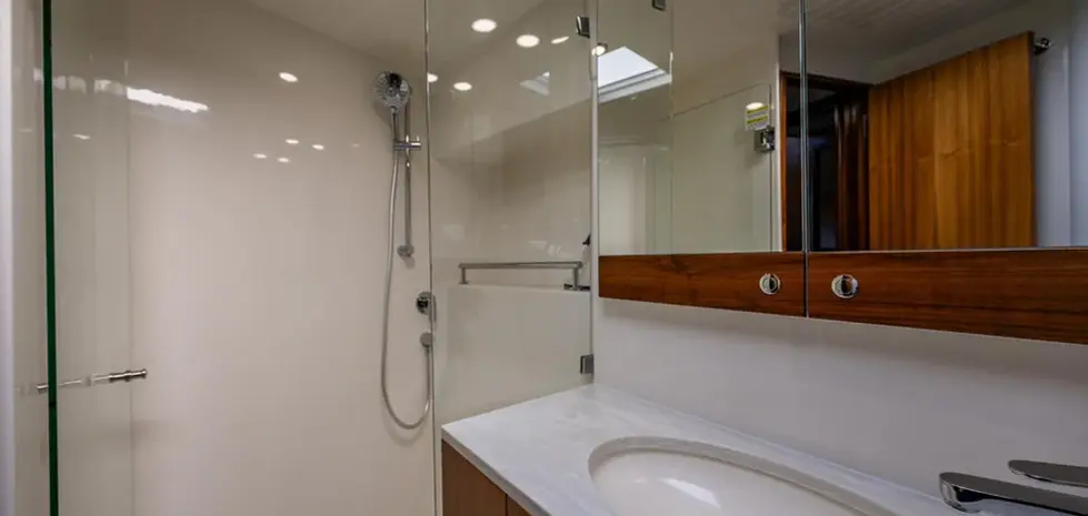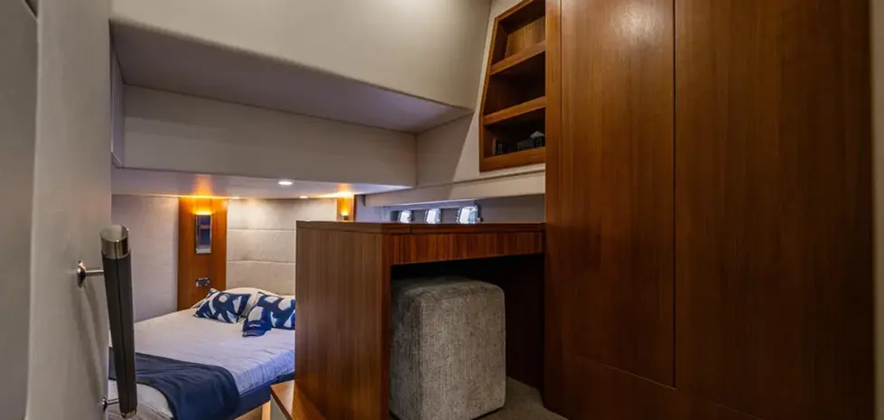Step aboard where a calm sanctuary awaits, created through elegant simplicity and luxurious finishes. The three beautifully crafted suites and staterooms comfortably sleep six and include the full beam owner's suite – with makeup vanity or study – and a third stateroom with side-by-side single beds that can convert into a double bed. The versatility and clever use of space is highlighted with the addition of an optional fold out bed on the flybridge bringing the total guest accommodation to eight. Together with a beautifully appointed aft galley equipped with Miele appliances and large pantry, you’ll want for nothing when entertaining or during long stays abroad.
